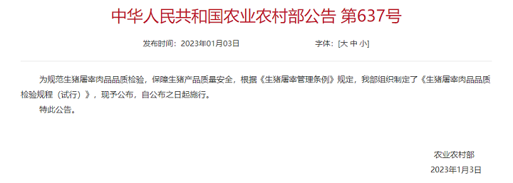 農(nóng)業(yè)農(nóng)村部公布《生豬屠宰肉品品質(zhì)檢驗規(guī)程(試行)》